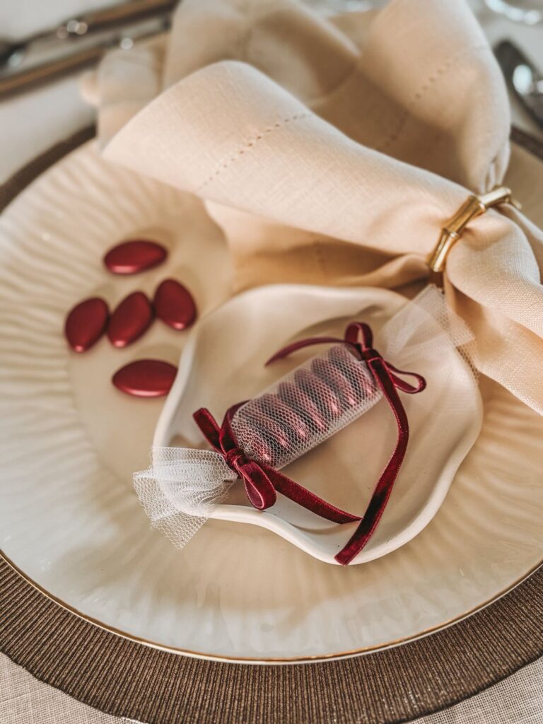 The winter atmosphere calls for warm, deep tones – and the Bijoux Supreme suagr dragees in metallic bordeuax color guarantee the most elegant, signature look for a winter wedding favor. The rich 70% dark chocolate perfectly balances with the ultra-thin sugar coating, creating a flavor that will truly enchant your guests. Pair them with simple white tulle and matching ribbons for an elegant favor that exudes sophistication and festive charm.